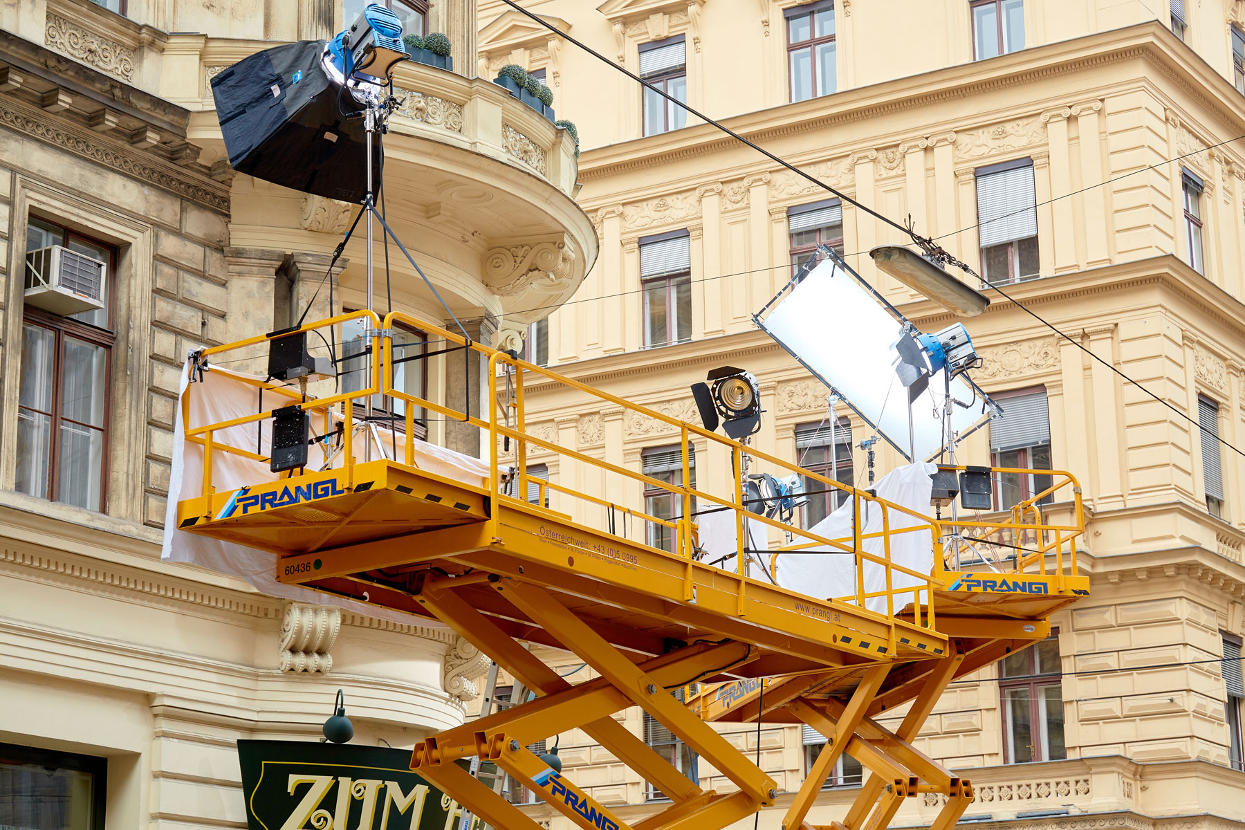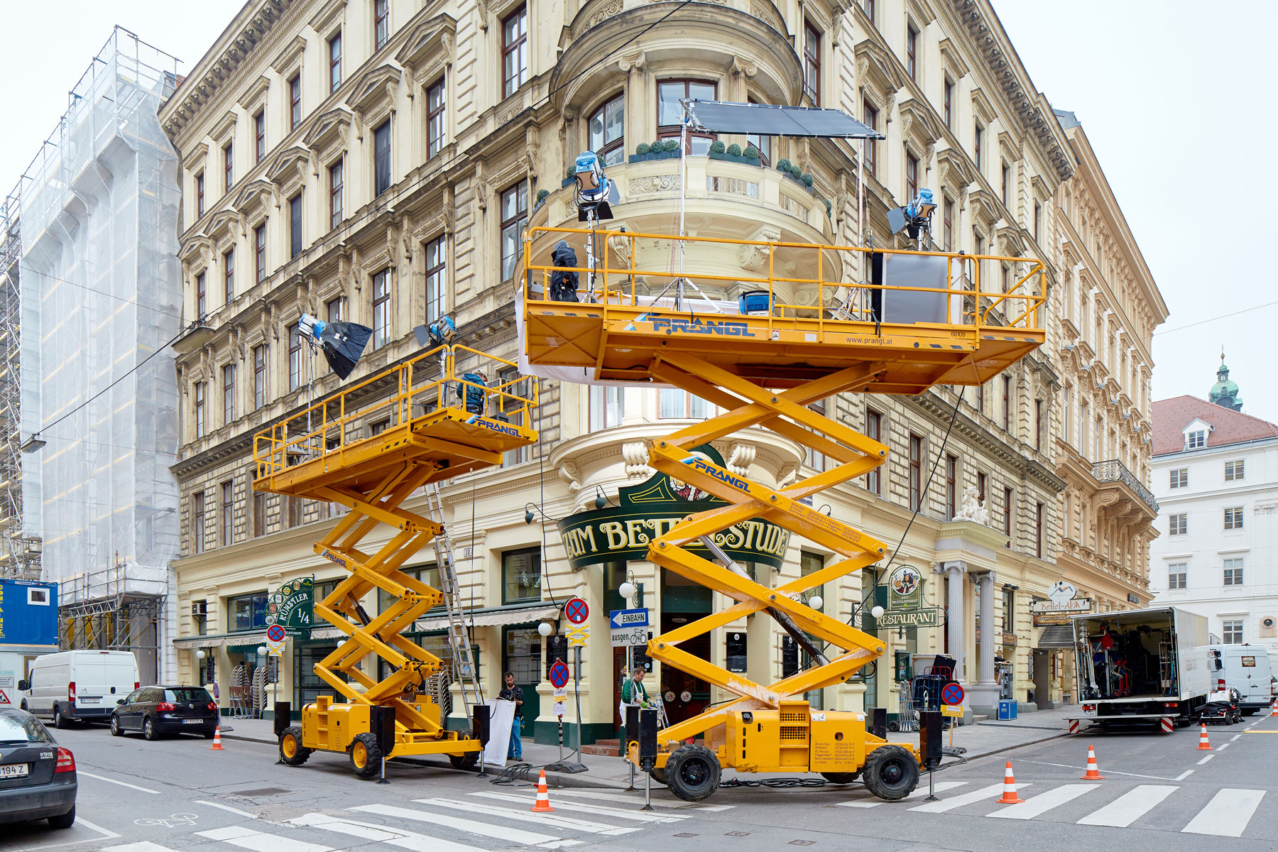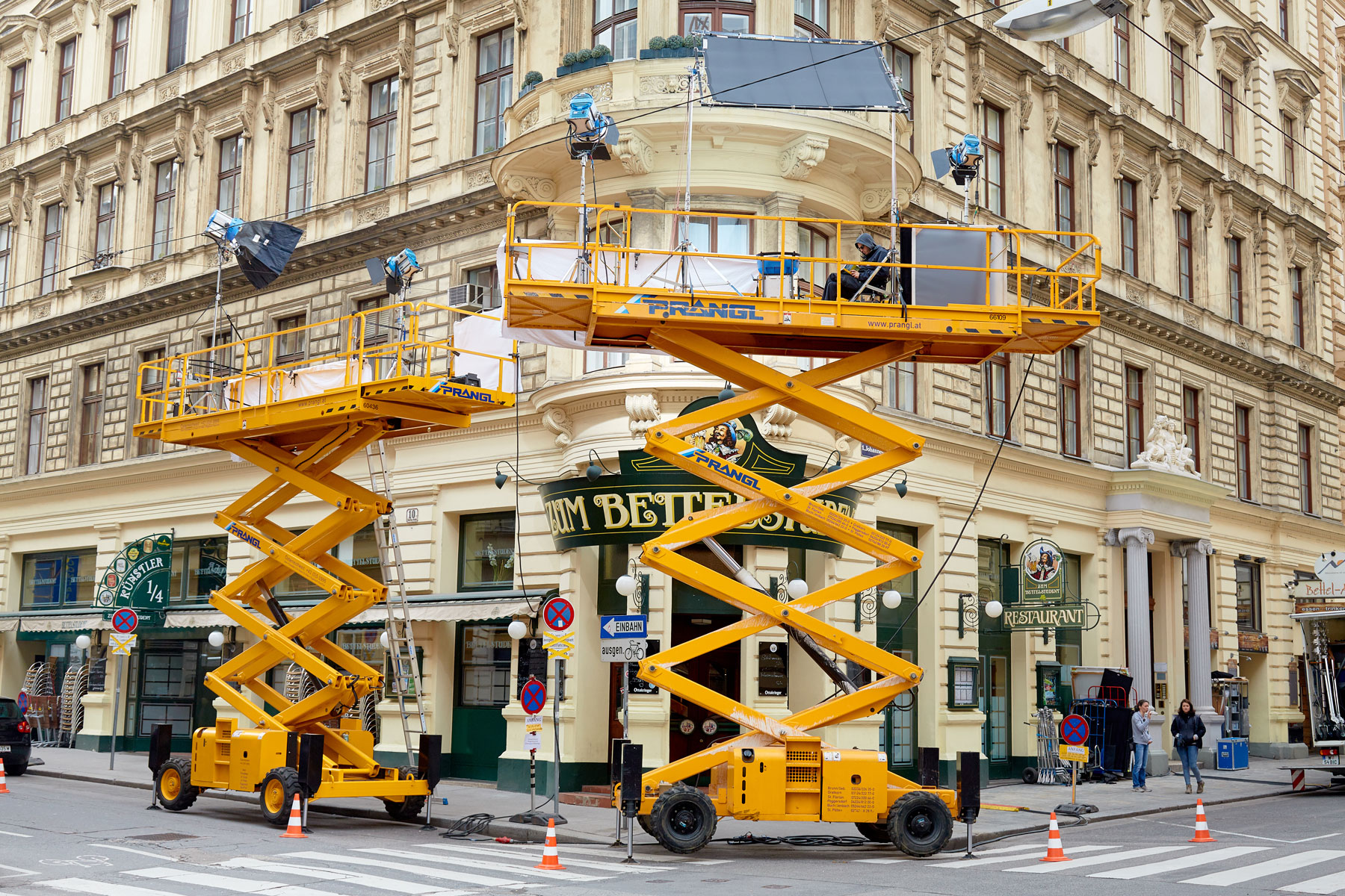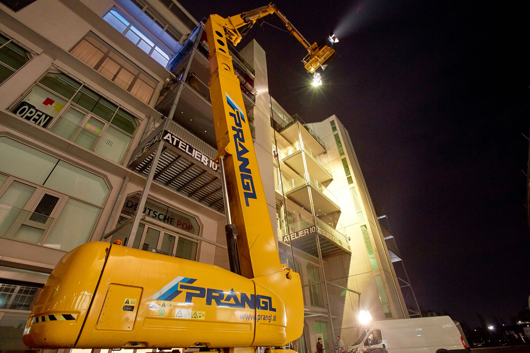 The Tatort episode with the working title "Die Faust" ("The fist") will be broadcast on the Austrian TV channel ORF in about a year. The perfect lighting was ensured by different Prangl aerial work platforms among other things. Our diverse fleet was used for eight different scenes: 5x 15-metre scissor lifts, 2x 10-metre scissor lifts and 1x 43-metre articulating boom lift.