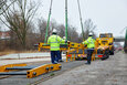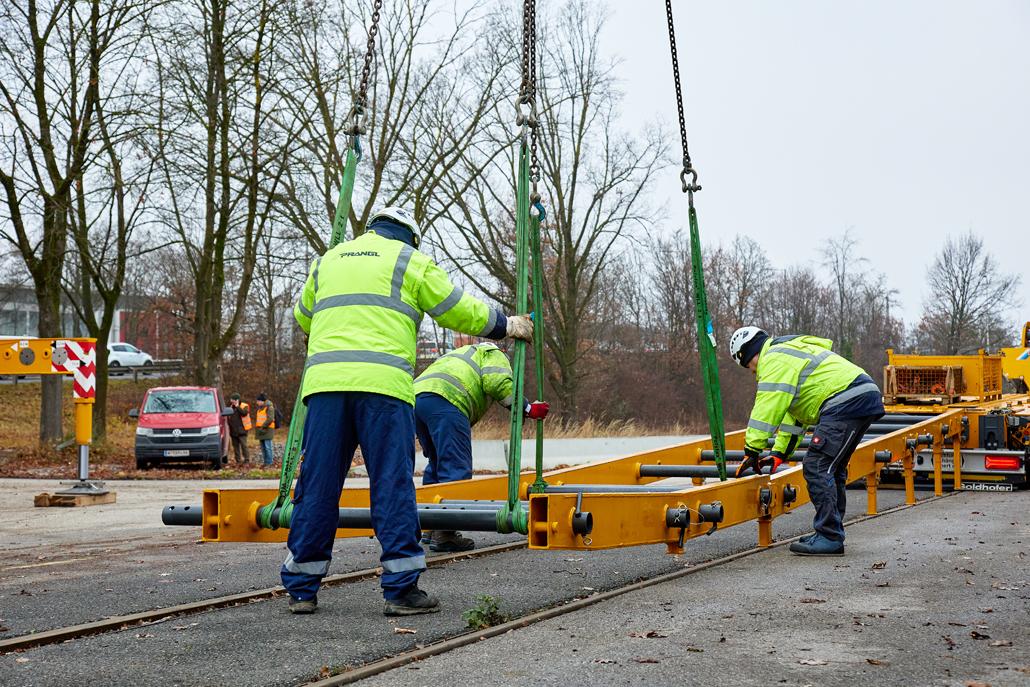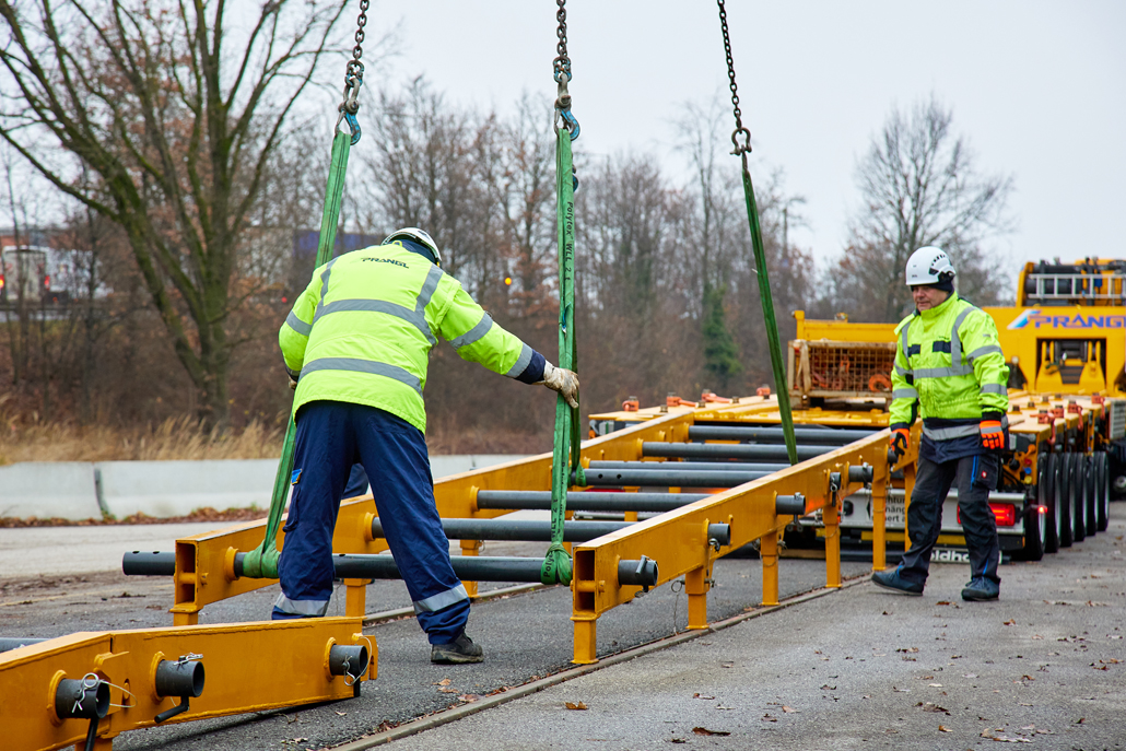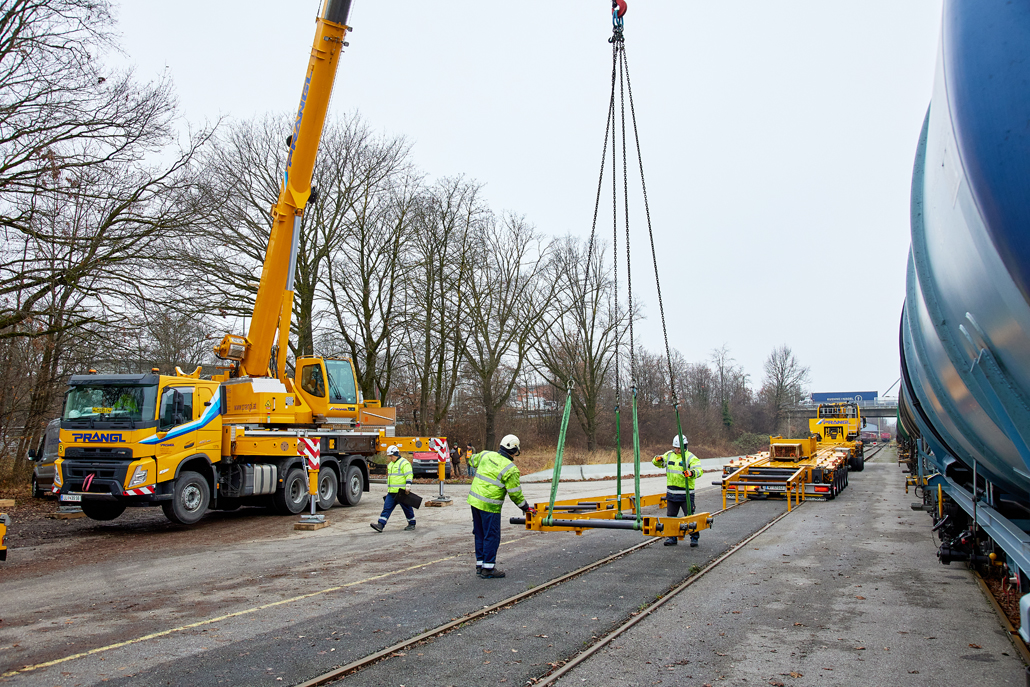 Once again, Prangl came up with a solution: road transport on a 4-axle HGV combined with a special 9-axle rail vehicle transporter. Work began at lunchtime: loading the train from the rail system onto the transporter required a special ramp consisting of several elements. The parts had been delivered beforehand by the 4-axle tractor unit and were waiting at the city harbour. One element after the other was moved using a 50 tonne truck-mounted crane – all while observing lifting and turning restrictions due to the overhead line – and installed by Prangl employees.