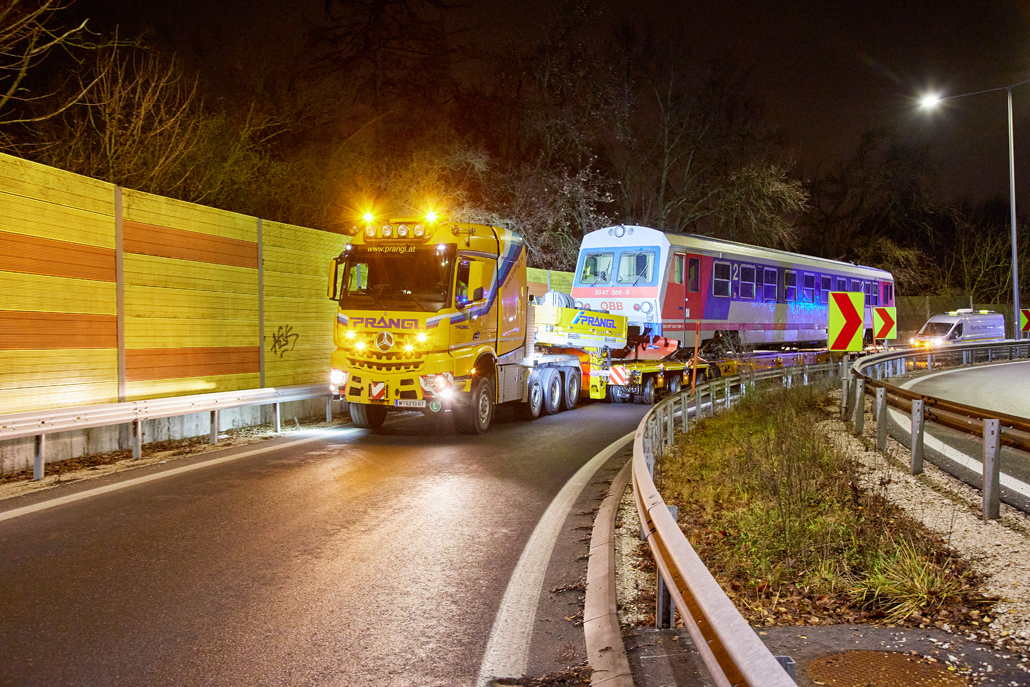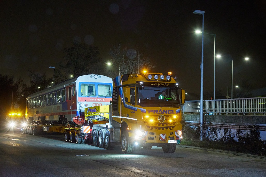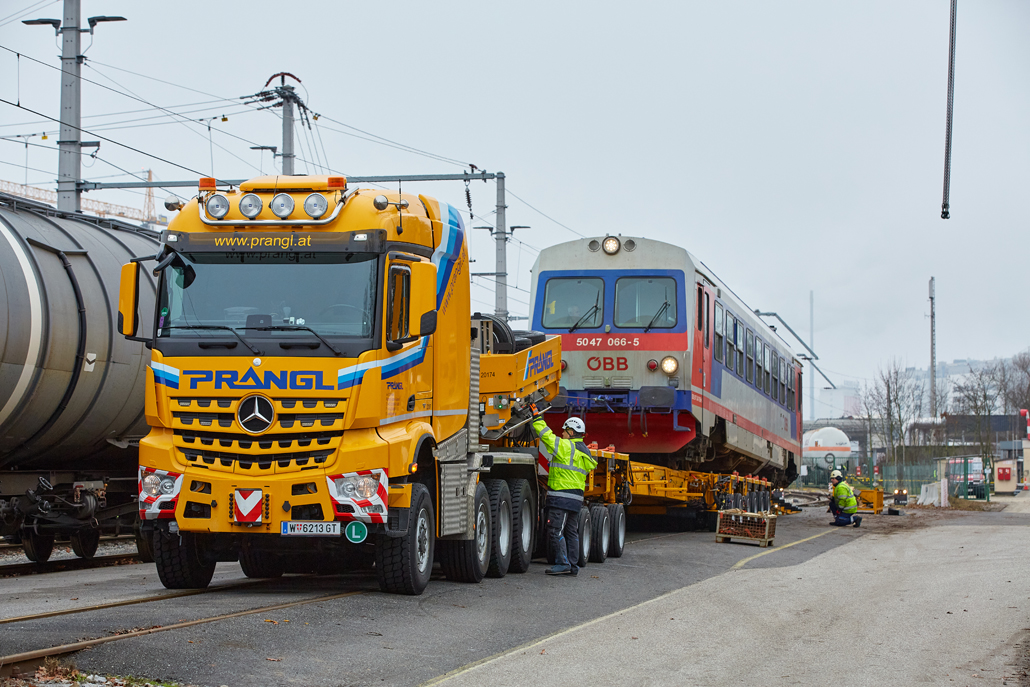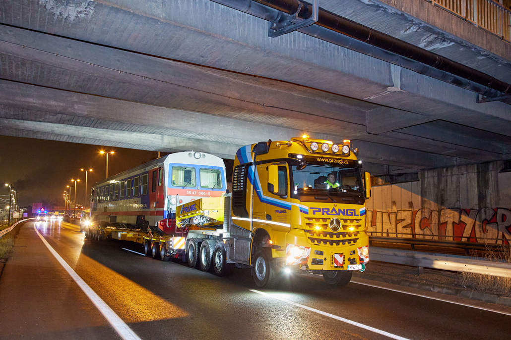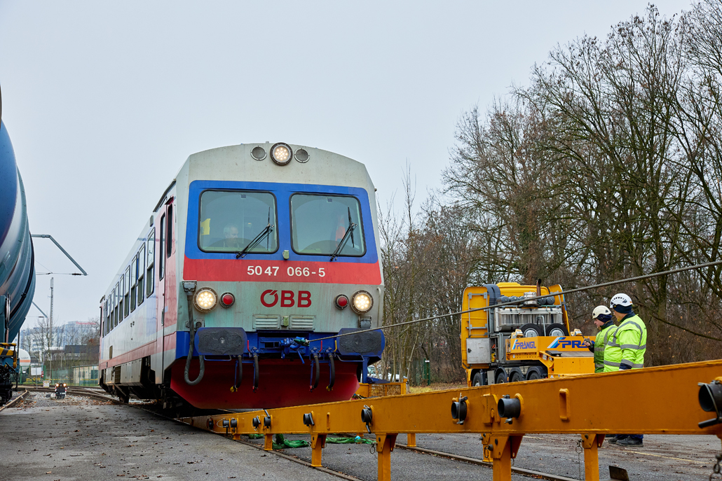 An ÖBB railcar weighing in at 58 tonnes was to be moved from Linz city harbour to the Mühlkreis railway station in Linz Urfahr. But the question was how, when no railway connection exists between the two stations? A challenge that a specialist like Prangl is only too happy to accept.