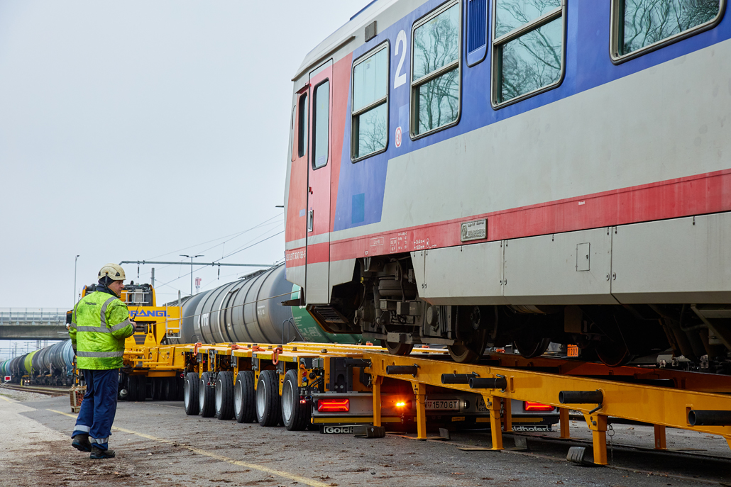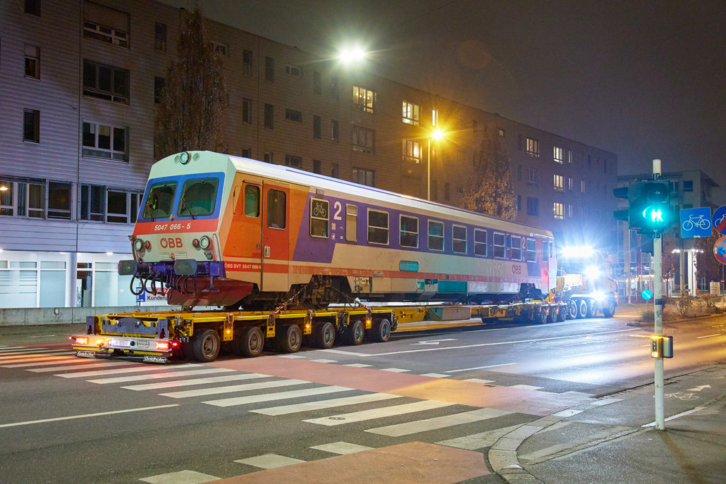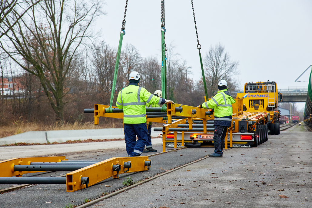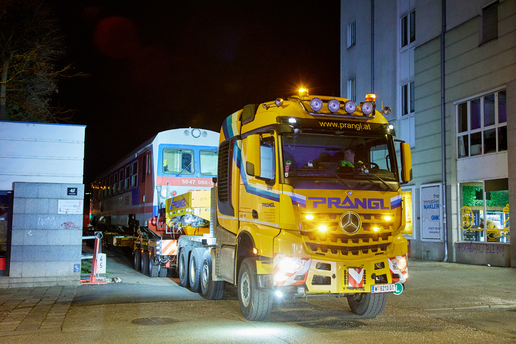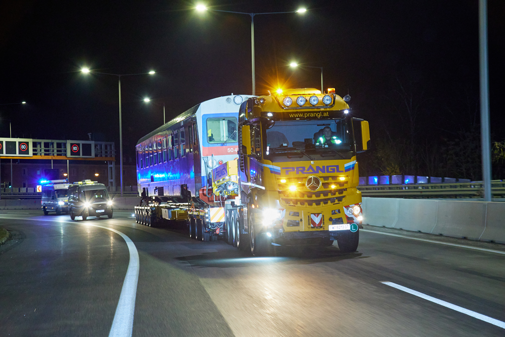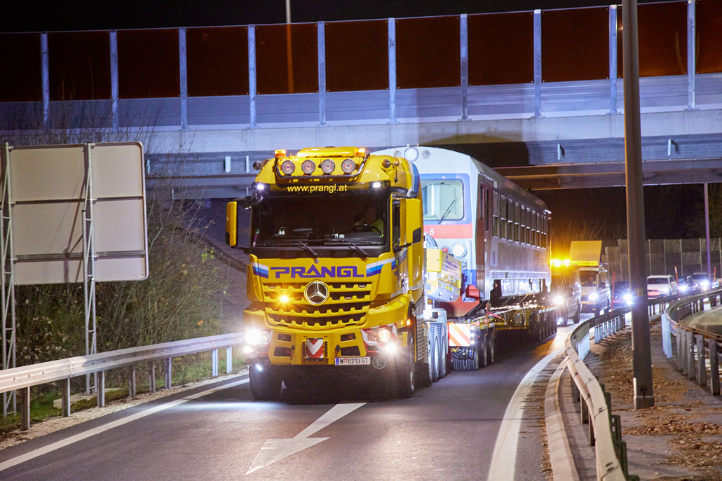 An ÖBB railcar weighing in at 58 tonnes was to be moved from Linz city harbour to the Mühlkreis railway station in Linz Urfahr. But the question was how, when no railway connection exists between the two stations? A challenge that a specialist like Prangl is only too happy to accept.