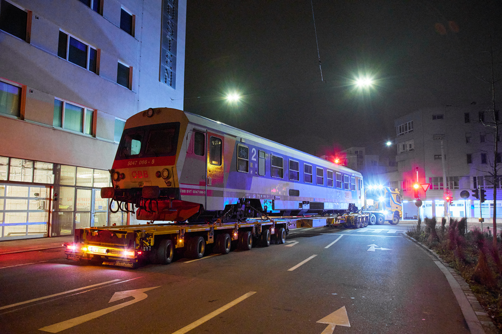 The rest of the journey through the city centre of Linz at night was challenging due to the convoy's impressive dimensions. The escort vehicles had to repeatedly close sections along the route to permit safe passage – often on the opposite carriageway. And the final section was the trickiest of all. In order to get the railcar back onto the railway tracks, the driver of the long transporter was required to reverse along the 320 metre long road. This went seamlessly and the train could be unloaded at its destination via the prepared ramp.