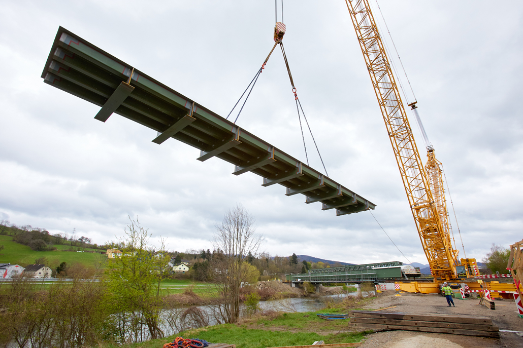 The lattice boom crane brought the parts of the truss bridge (weighing in at several tonnes) into position according to plan, where they were then welded and assembled. Piece by piece, the bridge was put together and with each part it grew. Those responsible for executing the project could not be halted by all the difficulties that arose beforehand, or by the sudden "onset of winter" that came about at the end of March - which of course made the work even more difficult. The exemplary team spirit ensured that this challenging project was completed to the utmost satisfaction of all parties involved.