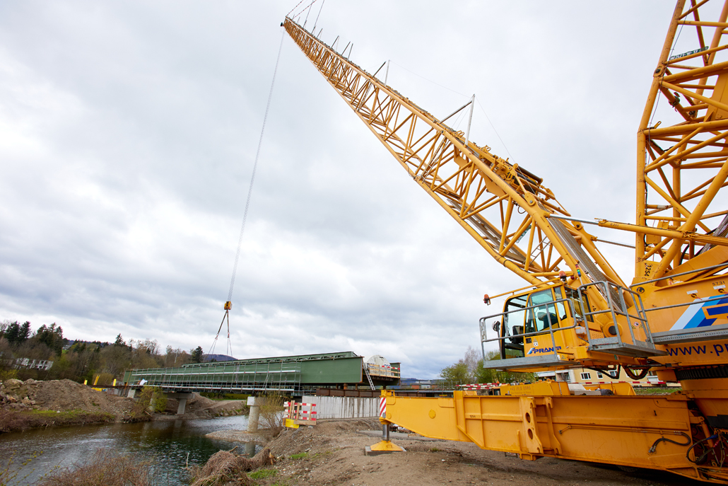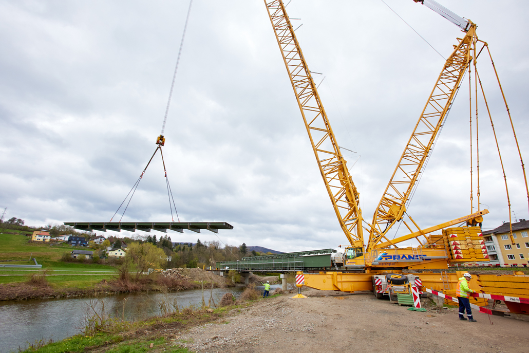 The Prangl team responsible for the project initially faced extensive preparatory works - not just in terms of logistics, crane selection and manpower planning; access to the area around the bridge in particular proved very difficult because the route crossed a goods road and bridge along it, which had an undefined load-bearing capacity. Following preliminary testing, it was therefore necessary to assume that this overpass was capable of bearing a total weight of 96 tonnes, which meant the access bridge had to be approved by a structural engineer.