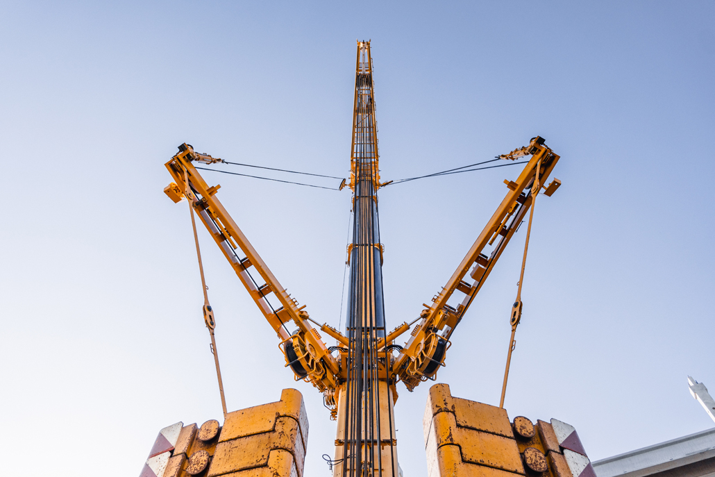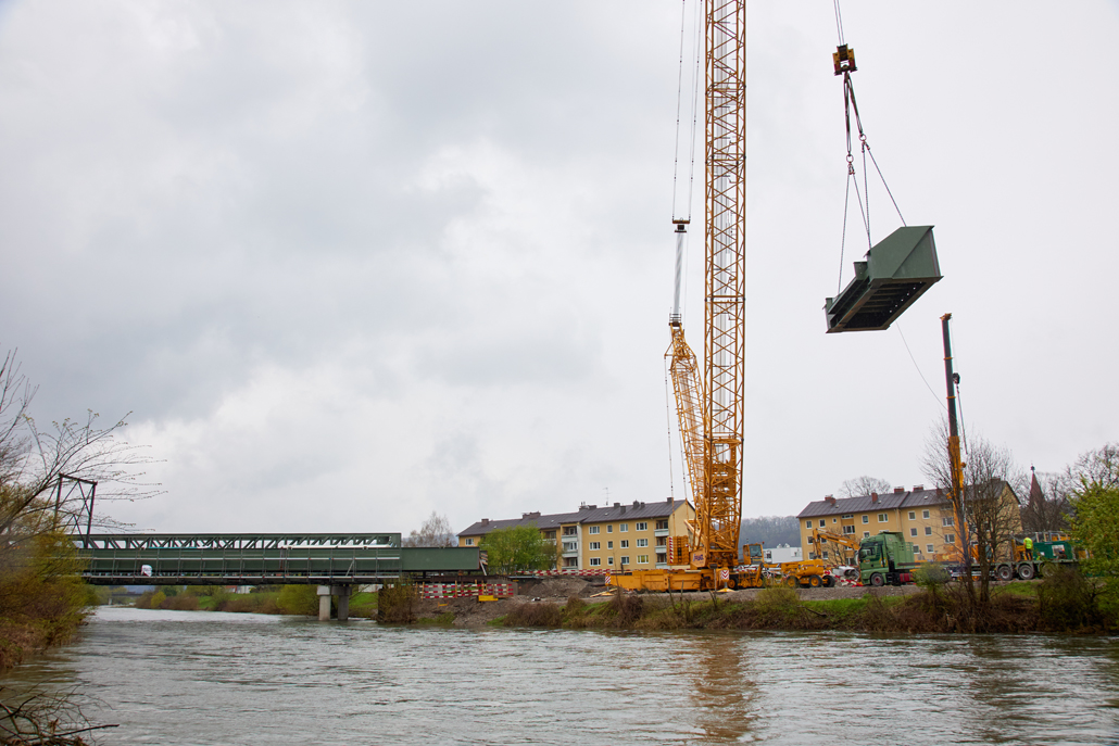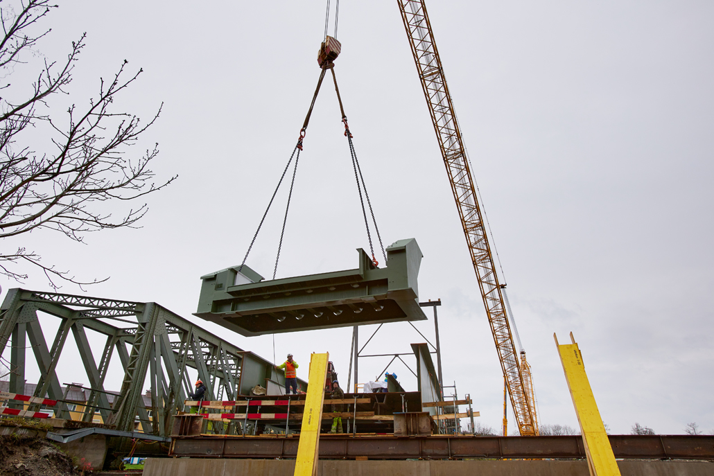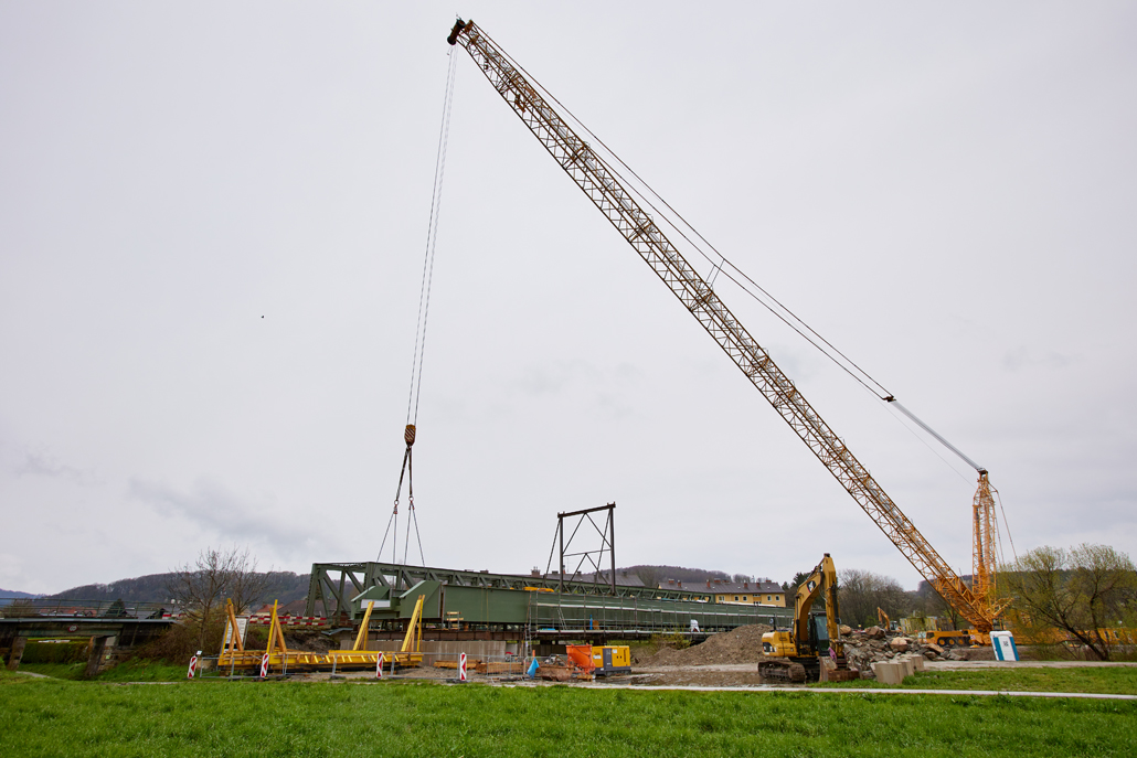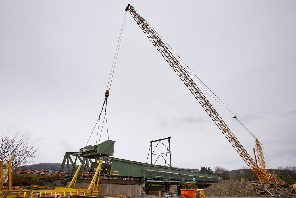 The main crane required a great deal of space: A 600 tonne lattice boom crane was the optimum choice due to the vast boom projection of 114 metres and the lifting weight (the heaviest bridge components weighed in at 36 tonnes). Meanwhile, a 100-tonne telescopic crane acted as an erection or auxiliary crane. Its task was to lift and "float" the ballast from the ballast table. Several other pieces of equipment were also used for preparation and follow-up work: a 45-tonne truck-mounted crane, an 85-tonne loader crane, a telehandler and an articulating boom lift. Once well prepared, the project could get going.