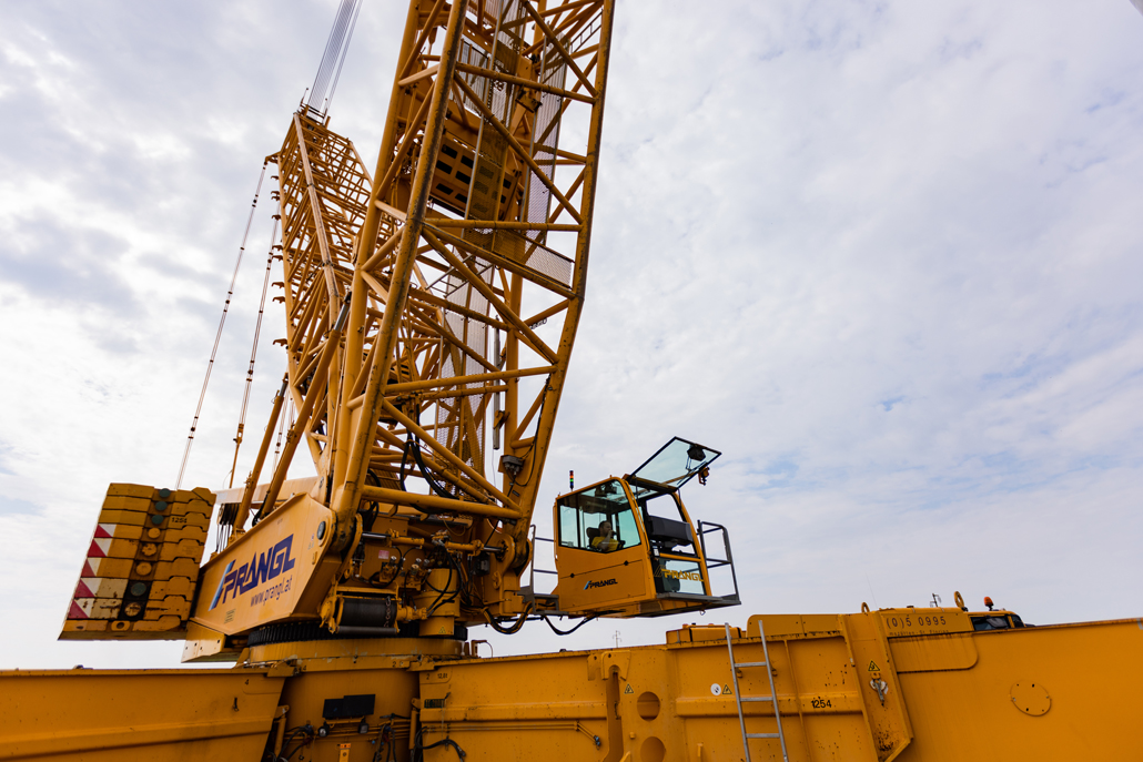 A 600 tonne lattice boom crane was the only solution for erecting the wind turbines, each with a hub height of 100 metres. This crane is not only perfect because of its tremendous strength. The low mobilisation costs and the fact that it is capable of being quickly moved from one stationary area to the next were also clear factors in favour of this giant from the yellow fleet. The giant crane was configured with a total system length of 120 metres. In total, the yellow colossus weighed in at 568 tonnes. The heaviest components to be lifted were the nacelles, each of which weighed 123 tonnes and were 11.4 metres long.