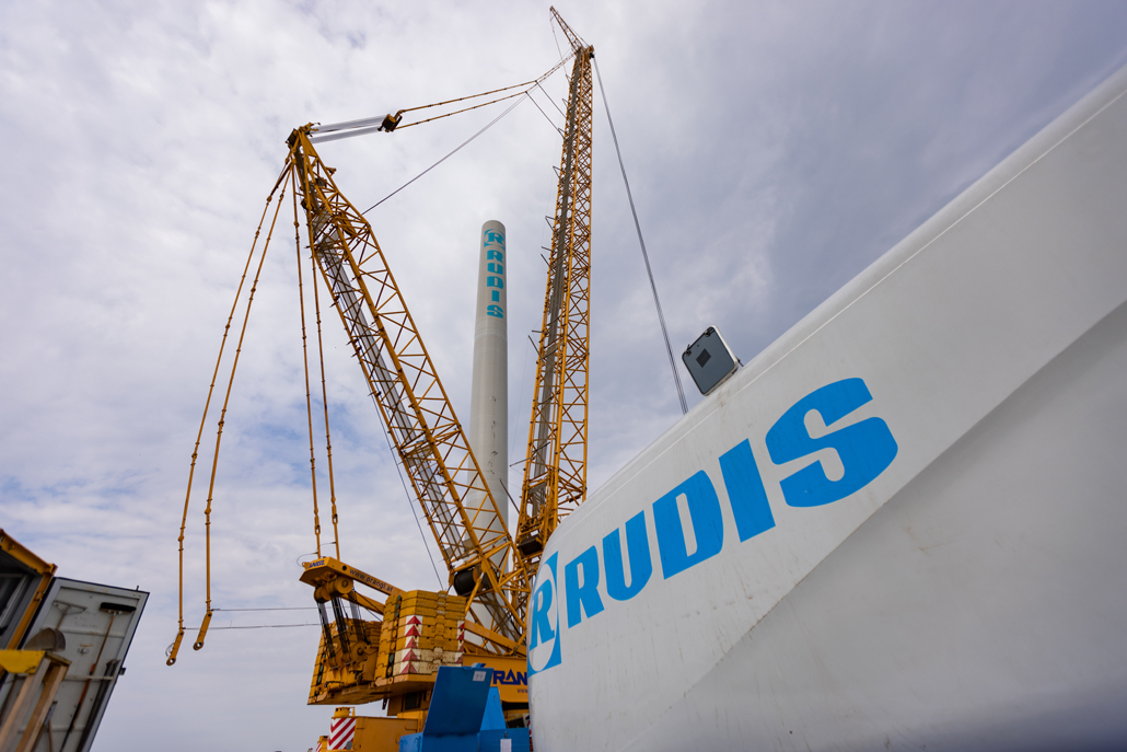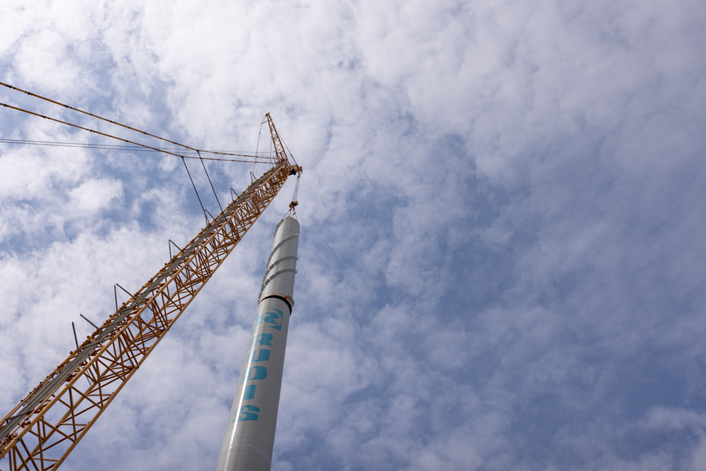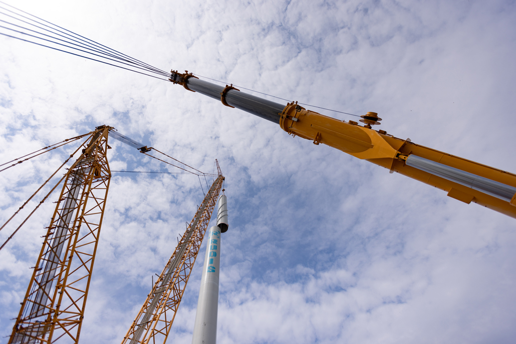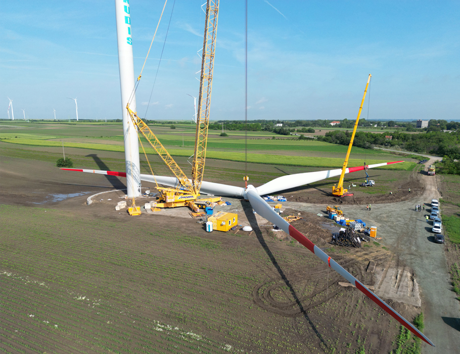 If the nacelle constituted the heaviest part of the wind turbine to lift, the positioning of the rotor star was the most difficult procedure. The three wind vanes in this wind farm were each pre-installed on the hub and lifted as one complete unit. Each of the three rotor blades is 81 metres long and weighs 19 tonnes, the hub alone 40 tonnes. This gave the star as a whole a diameter of 162 metres and a weight of 101 tonnes. The vane pre-assembly progressed with the help of a 100-tonne and a 95-tonne auxiliary crane: The rotor blades, which had already been installed, were each kept in equilibrium by an auxiliary crane until all three vanes were attached.
