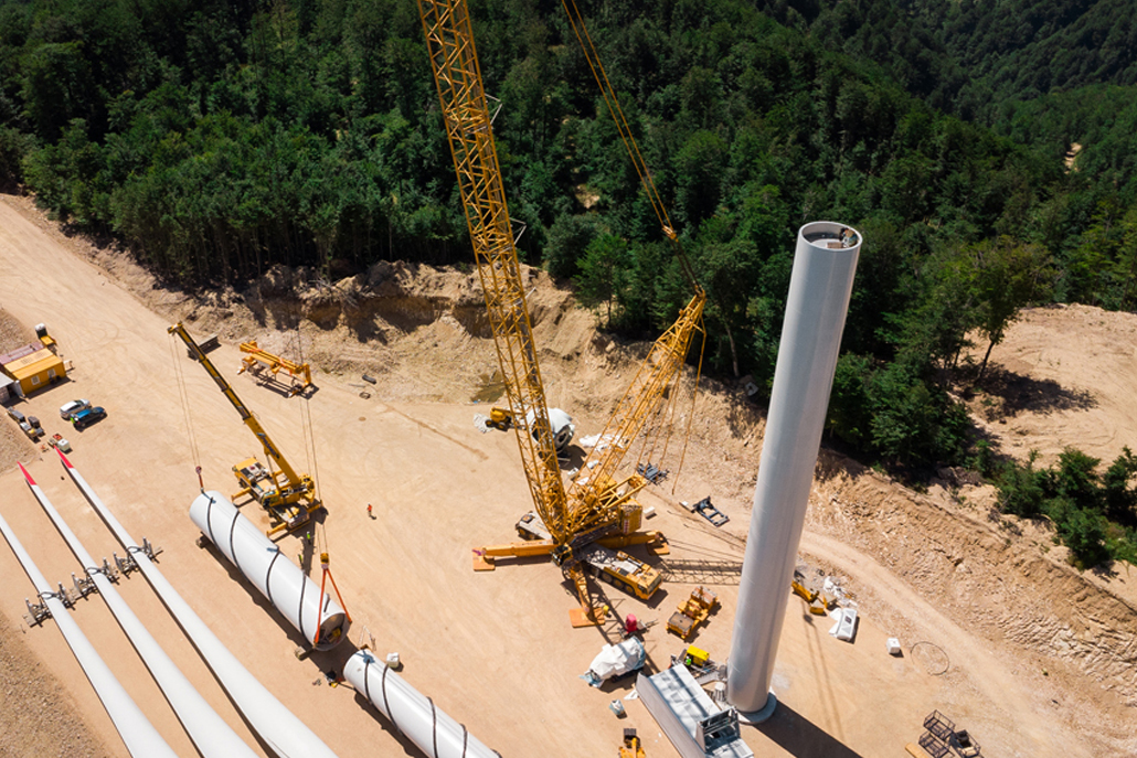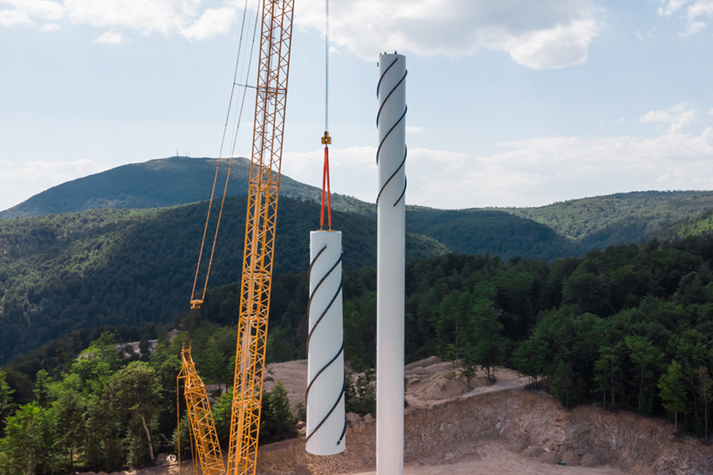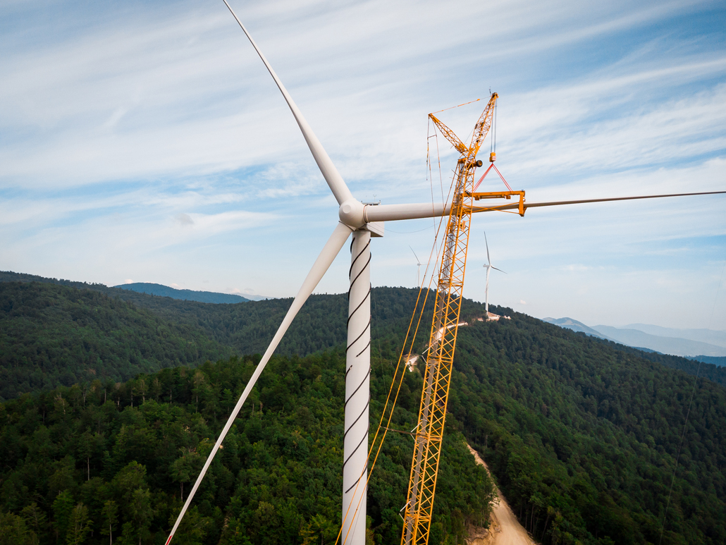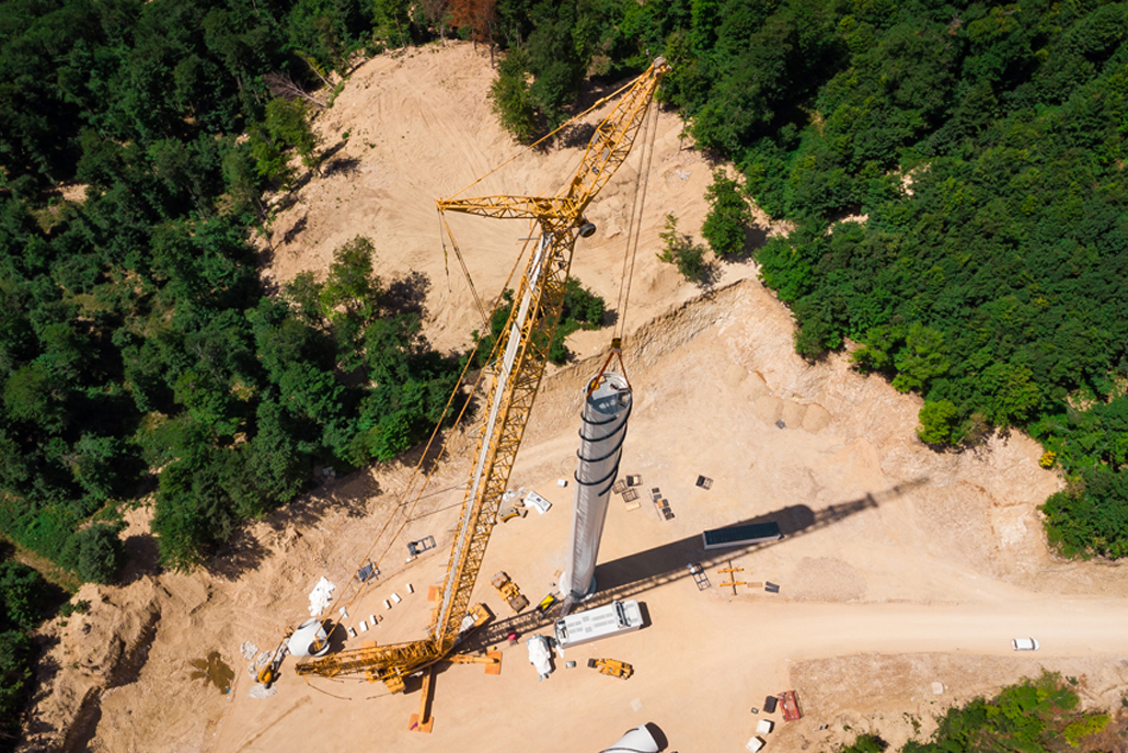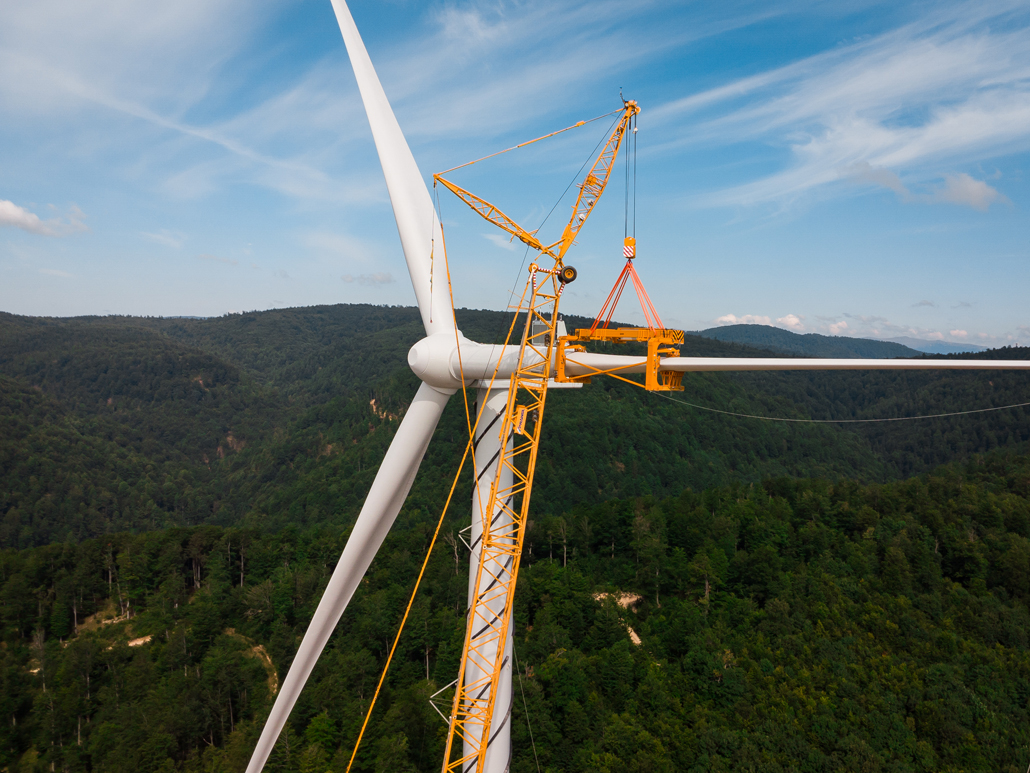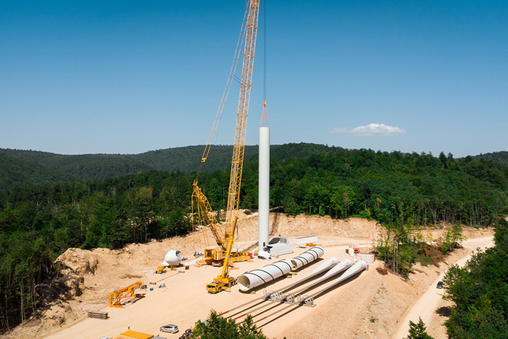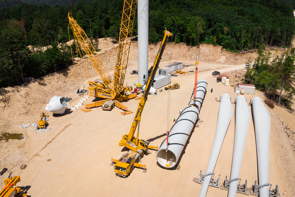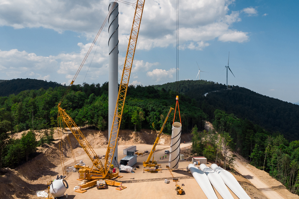 Next came the lifting of the nacelle, drive train and hub. They were lifted with utmost precision, one after the other, by the lattice boom crane. After these delicate installations at dizzying heights, all that was missing were the rotor blades. These were carefully lifted one by one by the yellow main crane and a telescopic crane and positioned with millimetre precision. One wind turbine after another was completed. With the support of Prangl, the new Ivan Sedlo wind farm is now set to produce enough electricity to supply more than 26,000 households from 2025 with a total output of 25 megawatts.