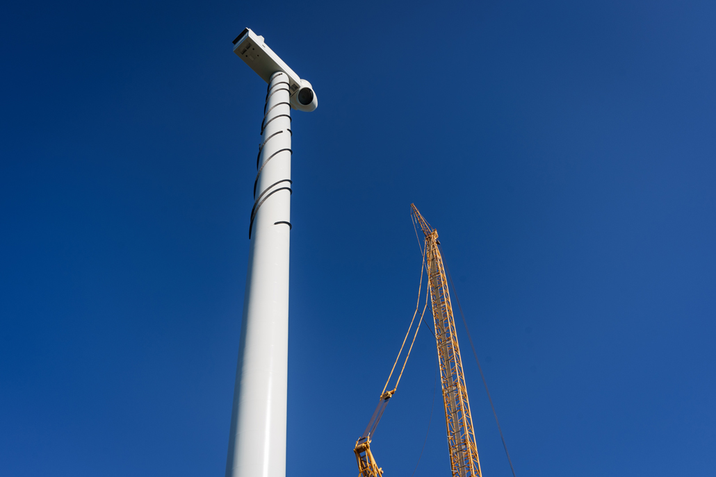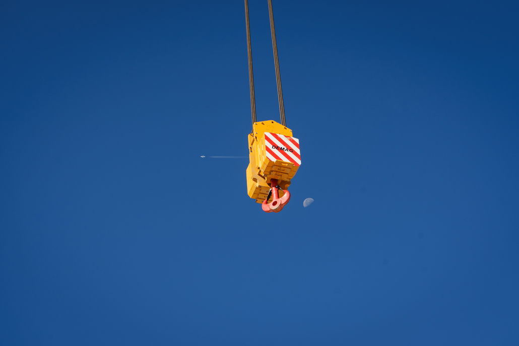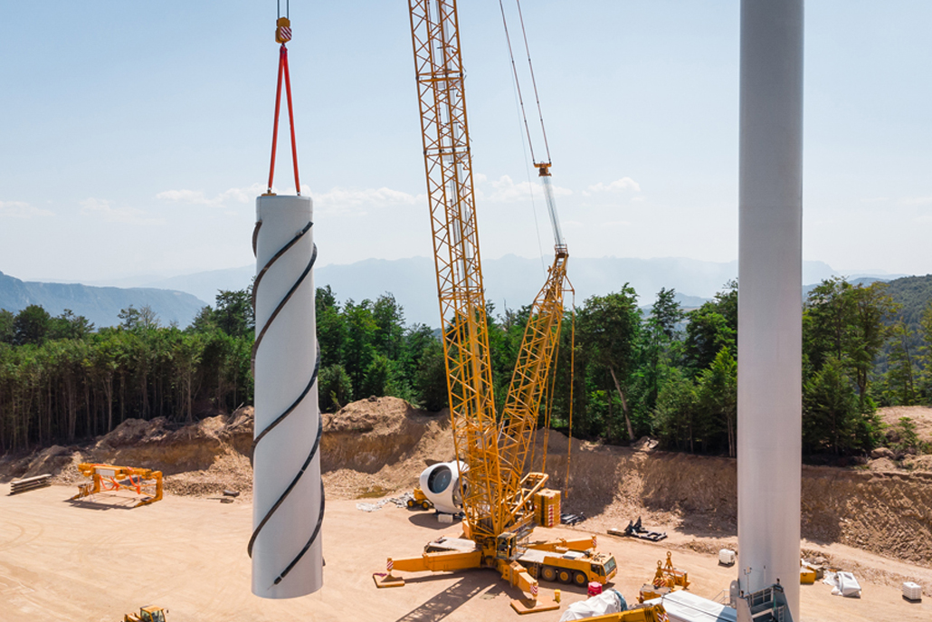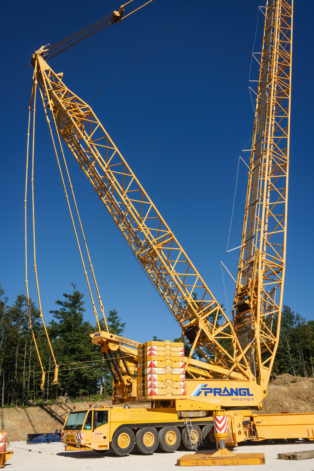 Optimum coordination on the construction site was of the utmost importance. The components of the wind turbines, which were ultimately to reach a hub height of 102.5 metres, were unloaded piece by piece at the construction site by the Prangl team using a 160-tonne and a 250-tonne telescopic crane. The heaviest parts were tower segments weighing 65 tonnes and the longest were the rotor blades at 72 metres. Interim storage had to be organised in such a way that the cranes could pick up the components in the correct order and that there was also enough space for the necessary pre-installations.