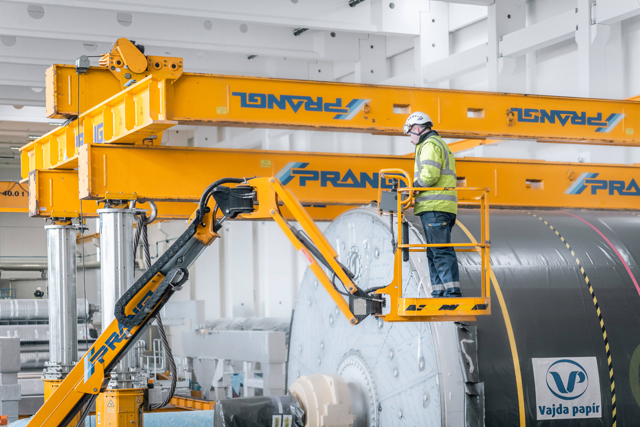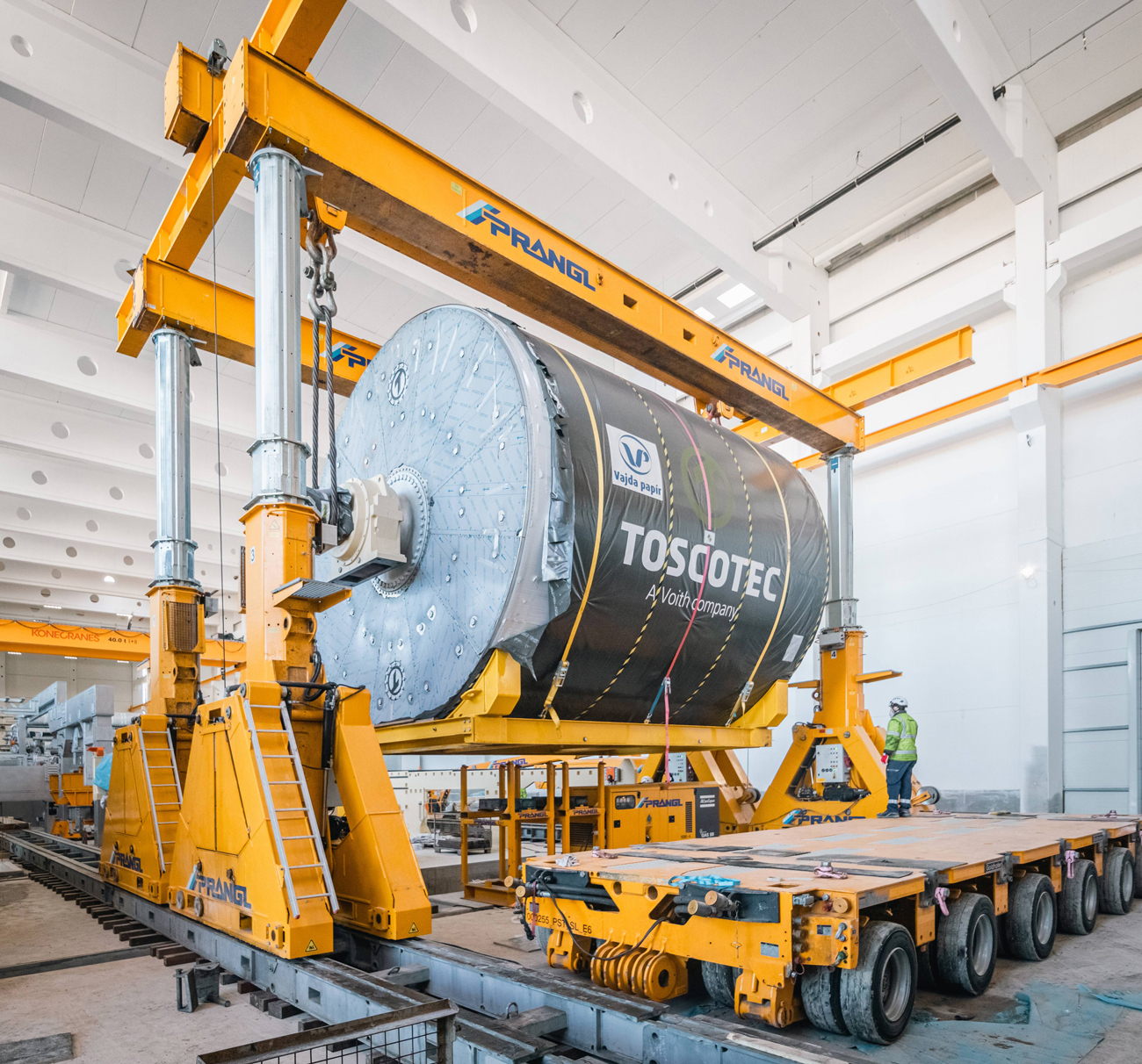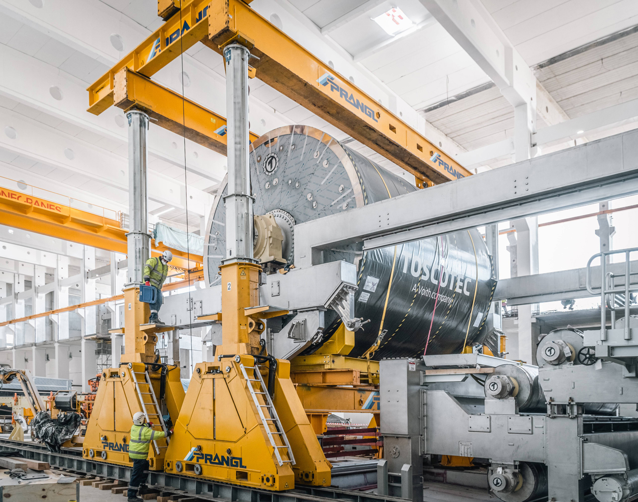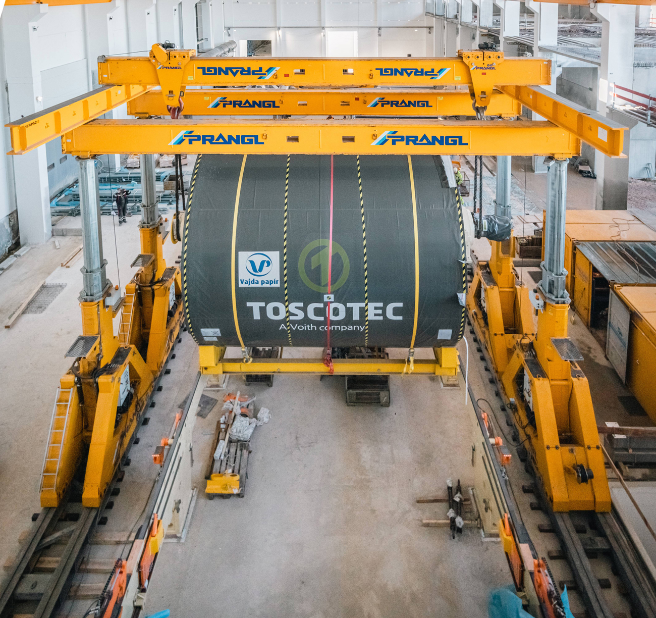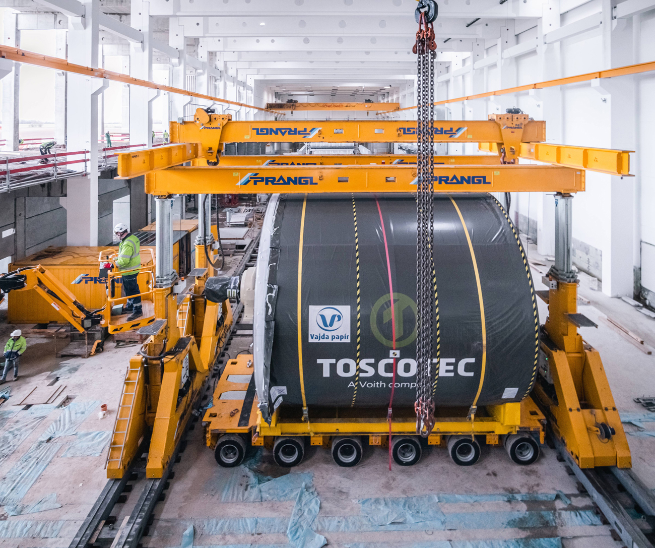 Prangl specialists were sent for to help with the expansion of a paper mill in Dunaföldvár, Hungary. A 145-tonne Yankee cylinder for drying paper had to be brought into the hall and “threaded” into its location - in the truest sense of the word. This was because space was in short supply due to the prepared installations.