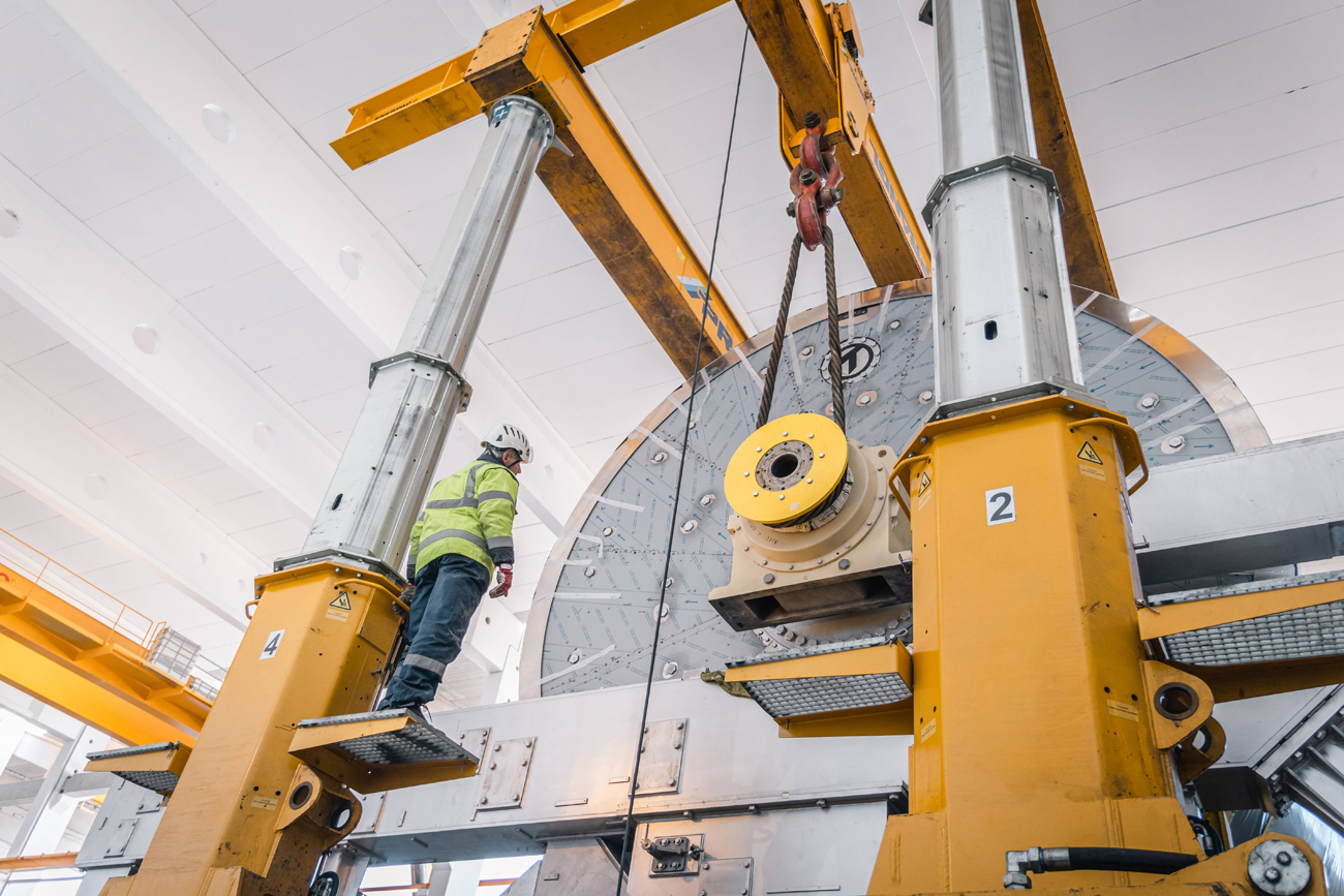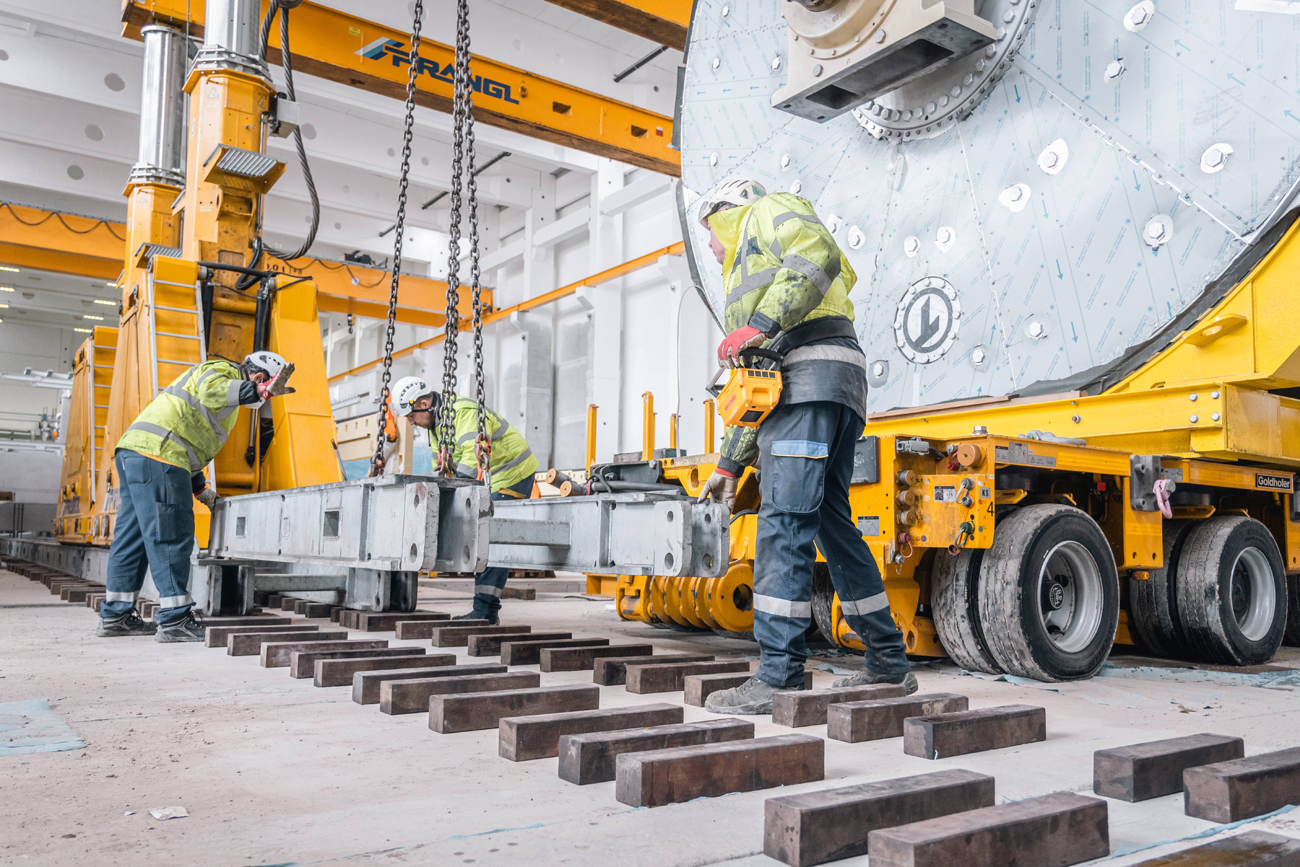 The powerful Yankee cylinder (5.70 metres high, 5.50 metres wide and 9.20 metres long) was driven carefully into the new production hall by a 6-axle self-propelled trailer and positioned diagonally beneath the hydraulic gantry. In order to have enough space between the rails, even the drive unit of the self-propelled trailer had to be dismantled. Then, the hydraulic gantry could take on the drying unit. But the task was still not finished; the Hungarian authorities still had to carry out a compulsory pressure test on-site.
